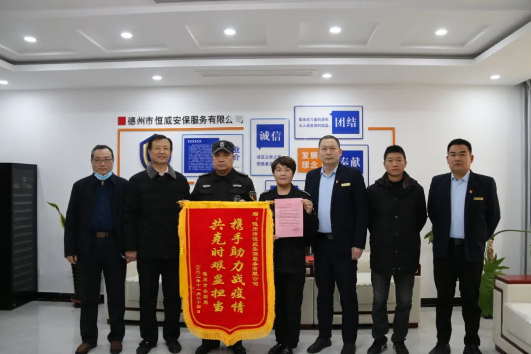 近日,德州市水利局領(lǐng)導、德州銀行領(lǐng)導先后到訪德州市恒威安保服務(wù)有限公司贈送錦旗,上面寫有“攜手助力戰(zhàn)疫情、共克時艱顯擔當”、“忠誠衛(wèi)士、勇于擔當”“紀律嚴明、作風優(yōu)良、防控有力、服務(wù)好的效率”,公司黨支部書記、總經(jīng)理王新衛(wèi),副總經(jīng)理王洪林、高印東、張有利參與來訪接待。