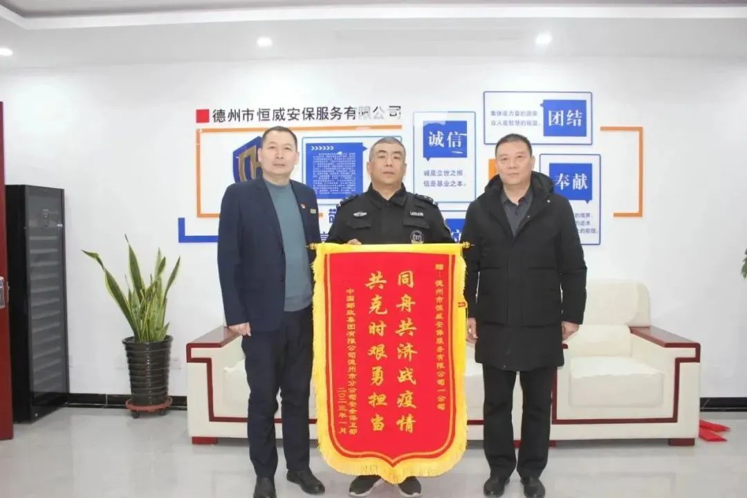 1月17日,中國郵政集團有限公司德州市分公司徐峰主任一行到訪德州市恒威安保服務(wù)有限公司并贈送錦旗,贊揚恒威安保駐郵政集團德州分公司班組履職盡責、踏實認真、勇于擔當,特別是在疫情期間安保人員24小時堅守工作崗位,嚴格防疫,切實為我公司安全有序運轉(zhuǎn)提供了有力的安全保障,對恒威安保人所做出的努力及無私奉獻、敬業(yè)忘我的出色表現(xiàn)表示充分肯定和衷心感謝。