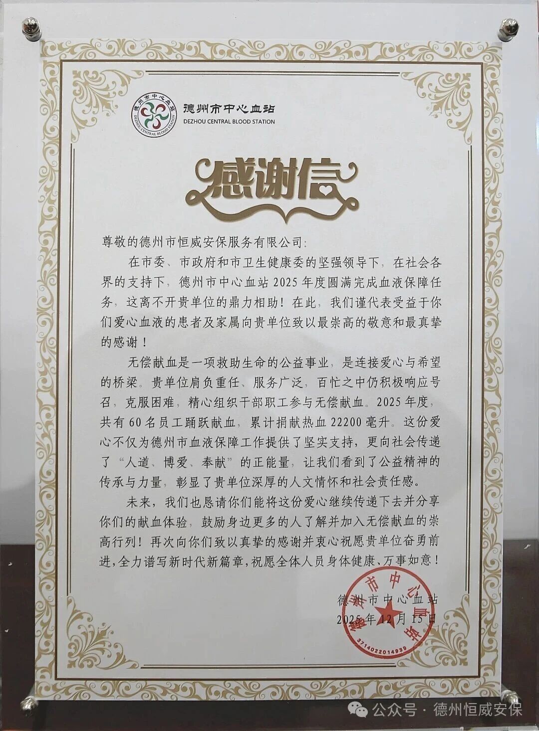 信中強(qiáng)調(diào),無償獻(xiàn)血是連接愛心與希望的生命橋梁。恒威安保公司雖肩負(fù)重任,卻能長期堅(jiān)持,克服困難,精心動(dòng)員組織。僅在2025年度,公司就有60名干部職工踴躍伸出臂膀,累計(jì)捐獻(xiàn)熱血22200毫升。這一組沉甸甸的數(shù)字,不僅有效補(bǔ)充了血液庫存,更向社會(huì)廣泛傳遞了“人道、博愛、奉獻(xiàn)”的正能量,彰顯了企業(yè)深厚的人文情懷和強(qiáng)烈的社會(huì)責(zé)任感。