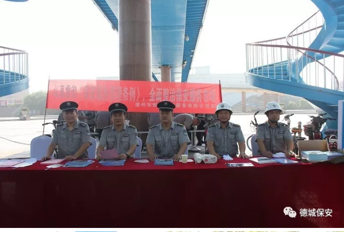 本次活動分為:展板宣傳、發放宣傳資料、向市民講解活動目的及保安行業發展等;其次全體保安員在廣場進行宣誓儀式;烈日炎炎下,保安員神情凝重,緊握拳頭,對來接受宣誓的領導莊重宣誓。宣誓中,每位保安員對自己肩負的神圣職責和光榮使命作出鄭重的承諾和讓,樹立起我是保安員我光榮,我是保安員我驕傲的思想。并時刻牢記我們是衛士,要用一顆赤誠的心維護駐點單位的安全和健康。第三通過各種媒體如微信公眾平臺、微信群、網絡、報刊等進行宣傳,向社會各界展現保安行業發展成就、保安員突出事跡、開展安全知識普及教育等亮點工程。