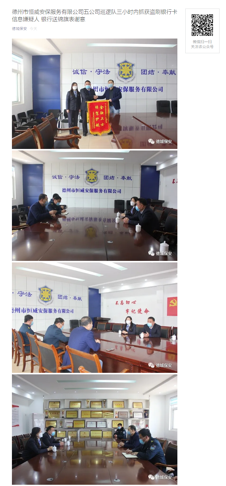 德州市恒威安保服務(wù)有限公司五公司巡邏隊(duì)三小時(shí)內(nèi)抓獲盜刷銀行卡信息嫌疑人 銀行送錦旗表謝意